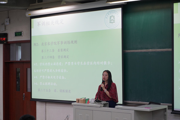 会议伊始,武丽老师告知了同学们军训的时间、地点;接下来,帮助同学们列出了军训所需物品清单,包括个人常用生活物品,清凉贴、防晒霜、晒伤药等防晒用品,并提醒同学们携带少量现金,以备不时之需;接下来,老师向大家展示了军训基地的照片,并向同学们强调了军训时期的纪律和要求,同时,公开了军训指导员及学生助理的联系方式,方便同学们在军训遇到特殊情况能够及时得到处理。祝愿同学们能够顺利完成军训。