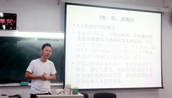 旅游管理系主任马亮,首先向大家回忆了当时自己学习本专业的情况和来到北京农学院后本专业发展的情况,迅速和新生拉近了距离。其次,马老师向大家简单介绍了本专业的情况,马老师说:旅游管理专业虽然成立时间不长,还很年轻,但是旅游业迅速发展成为全球最大的产业,推动了经济发展,解决了大量的就业问题。所以同学们的就业面非常广泛,还可以进行相关的创业。之后马老师还向同学们介绍了本专业的研究内容和专业方向以及课程设置和学分的情况,特别强调了高等数学和英语等基础课程的重要性。