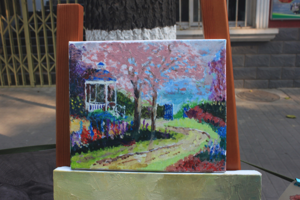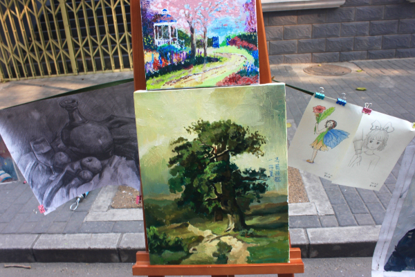 甬路两侧树下,数十把画架,画架间相连绳子悬挂的精美画作,无论何时,总能吸引路过的大批同学围观赏评。有的同学更是拿出相机手机,专程前往拍下自己心仪的画作。