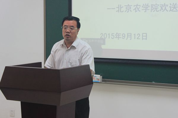 首先学生处处长韩宝平上台讲话,他首先欢迎双培新生入学北京农学院,同时也对他们入选双培计划表示了祝贺。他也不忘叮嘱大家上了大学仍然要以学业为重,提出了参加一个社团、参与一项科研、和进行一次实践活动这三点要求。