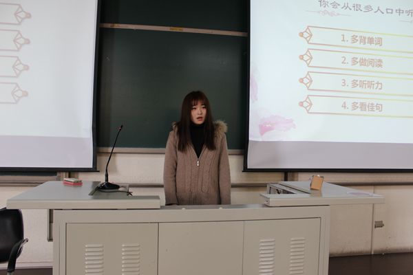 随后,夏蔚玲同学作为一次通过英语四级的学生代表上台发言。她提倡“让四级活在我们的生活里”,并提出“把英语看得更日常化一些”、“不要死找窍门”等观点。为了让同学们考试更加轻松,夏蔚玲同学还准备了一系列考前小贴士。