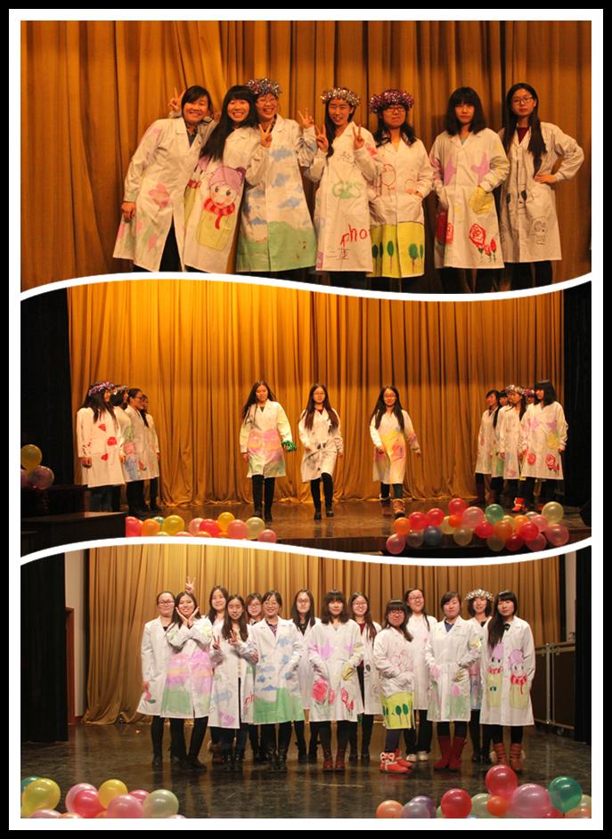研究生结合本学院科研特色,用水彩画笔在单调的实验服上施展无尽的想象力,一件件白色的实验服变得绚丽多彩。