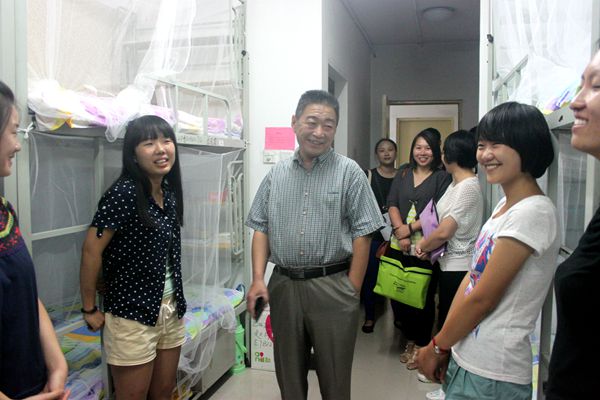 党总支书记王万山、副院长张克中、团总支书记王雪、辅导员周伟婷老师和新生班主任杨玲、张文玲、何祥凤、赵亚洲、王润老师一同探望新生宿舍。