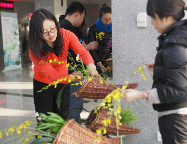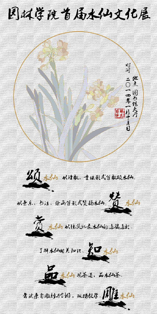 此次水仙文化展的主题是:“颂水仙、赞水仙、赏水仙、知水仙、品水仙、雕水仙”。在本次水仙文化展上,参观者可以一睹水仙花千姿百态的文化艺术魅力。“春江水暖”、“母子情”等学生和老师的72件水仙花插花,雕刻及组合造型惟妙惟肖,千姿百态,清雅幽香,不仅给参观者以视觉和嗅觉的享受,也给人们带来春的气息和美好的希望。