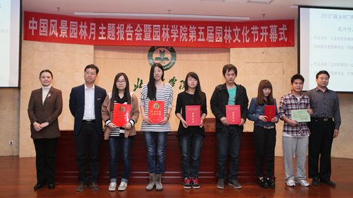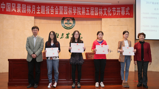 由李金苹、郑健老师指导的2010级林学专业孔欣然、于雅慧、白果完成的《NaCl、PEG胁迫对华北紫丁香和暴马丁香种子萌发的影响》和2010级林学专业董开茂、张蓉、石杰霞完成的《GA3、温度和光照对薄皮木种子萌发的影响》获得2013年大学生课外学术科技作品竞赛第七届“挑战杯”首都三等奖。由马晓燕老师指导2009级风景园林专业李杨完成的《行走的花园模块--中关村二小校园景观设计》和卢圣老师指导2009级风景园林专业任傲尘完成的《空间的语言--山西临汾尧都公园设计》获得2013"园冶杯"风景园林国际竞赛设计作品三等奖。学生工作部部长韩宝平、中国风景园林学会业务部副主任付彦荣、中国风景园林学会会员部副主任张映晓为获奖学生颁奖。