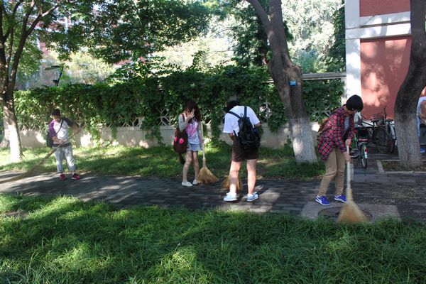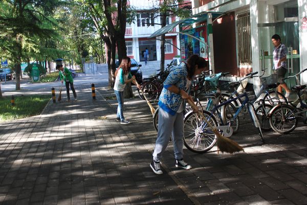 2012级旅游管理1班全体同学积极开展了清扫活动。女生们用扫把清扫小路上的落叶和垃圾,用双手捡拾草地上的杂物与落叶。男生们摆齐楼前停放的自行车,清运走打扫成堆的垃圾杂物。他们分工明确,配合默契,经过一个多小时的辛勤劳动,同学们将1-3号办公楼周边清理得异常整洁。