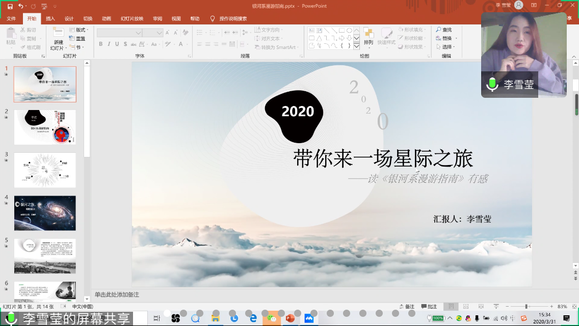 最后研究生辅导员史雅然老师对云端汇报会进行了总结,并叮嘱大家遵守学校规定,不要返校。在家认真上网课,抓紧学业。同时注意个人和家人防护安全,并祝大家身体健康,家庭幸福康乐。