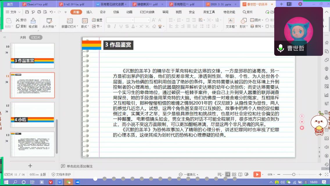 19林业的曹世哲同学给我们带来的是托马斯·哈里斯的《沉默的羔羊》,书中莱克特和史达琳的交锋是最经典的的桥段,一方是邪恶的诸葛亮,另一方是初出茅庐的刘备,他们的反差非常大,渗透到性别、年龄、个性、为人处世各个层面,这为他俩的互相利用创造了绝妙的条件。《沉默的羔羊》为恐怖故事加入了精细的心理分析,讲述犯罪同时也审视了犯罪的心理本质,这使其成为划时代的恐怖和心理悬疑的经典。羔羊具有一定的隐喻作用,大多数人在现实生活中经历痛苦后选择默默承受,不愿去做出改变,我们就像圈门里的羊,即使打开圈门也不会逃跑,心都被自己禁锢,逃跑又有何意义。如同史达琳儿时抱着羊羔逃跑,即使跑到哪也走不出心魔。其实又何止克丽丝在挣扎,汉尼拔在挣扎,野牛比尔也在挣扎,我们,也都并不仅仅是沉默的羔羊。只是不同的人,不同的生命历程,让我们谱写了不一样的生命旋律。在这个汇报会上曹世哲同学的分享好像是春天突来的雨水和狂风,虽然疯狂但也是春天的一部分,一个不一样的春天景色。