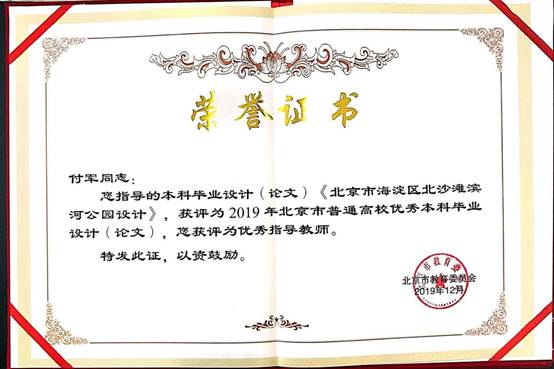 本科生毕业设计《北京市海淀区北沙滩滨河公园设计》被评为2019年北京市普通高校优秀本科毕业设计。指导教师付军教授被评为优秀指导教师。