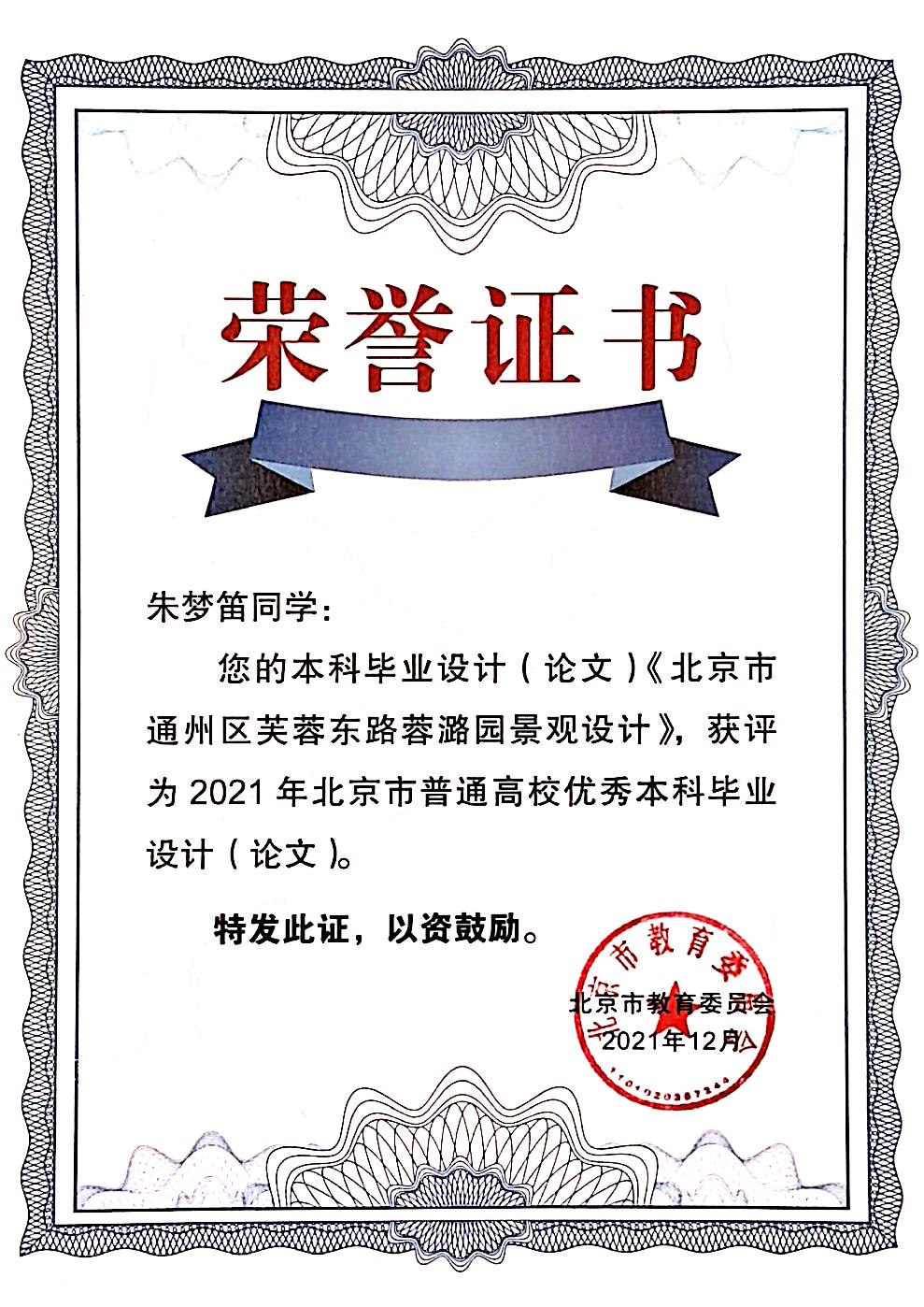 祝贺朱梦笛、陈傲、于秋莹三位学生的本科毕业设计(论文)获评为2021年北京市普通高校优秀本科毕业设计(论文)