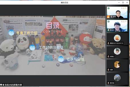 按照学院制定的冬奥会志愿者走进班级分享冬奥事迹的工作安排,学院的闭环内志愿者、闭环外志愿者和城市志愿者分别在线上用PPT的形式向与会同学汇报了他们在参与冬奥志愿服务、上好“冬奥大思政课”的收获和感受。让更多的在校大学生了解了志愿者们参与服务过程中许多不为人知的精彩故事和感人事迹,被他们的奉献精神所感染。