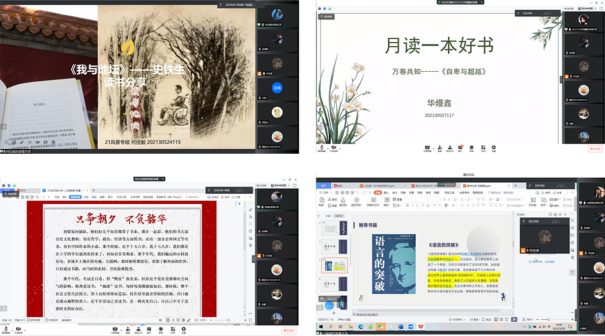 首先,何佳毅、那悦琪、李鑫、刘金石、华熳鑫、郑昊东6位同学分别就《我与地坛》、《平凡的世界》、《追寻生命的意义》、《精力管理》、《自卑与超越》、《人性的弱点》这6本书籍为我们进行了阅读感悟分享,一起分享了书中的精神力量。