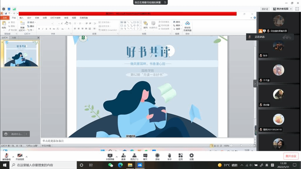 第62期“月读一本好书”活动在“腾讯会议”平台线上举办,本期的主题是“好书共读——微风萦耳畔,书香漫心田”,此次读书会重在引导,旨在营造“多读书、好读书、读好书”的氛围,希望读书可以深入大家的学习和生活,丰富大家的心灵。本期活动由香港六合彩开奖