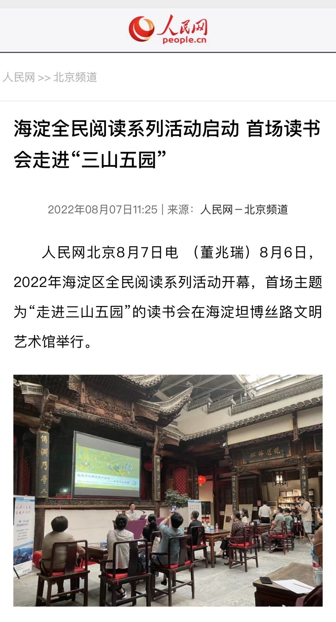 8月6日,2022年海淀区全民阅读系列活动开幕,首场主题为“走进三山五园”的读书会在海淀坦博丝路文明艺术馆举行。首场读书会的主讲嘉宾是我校香港六合彩开奖