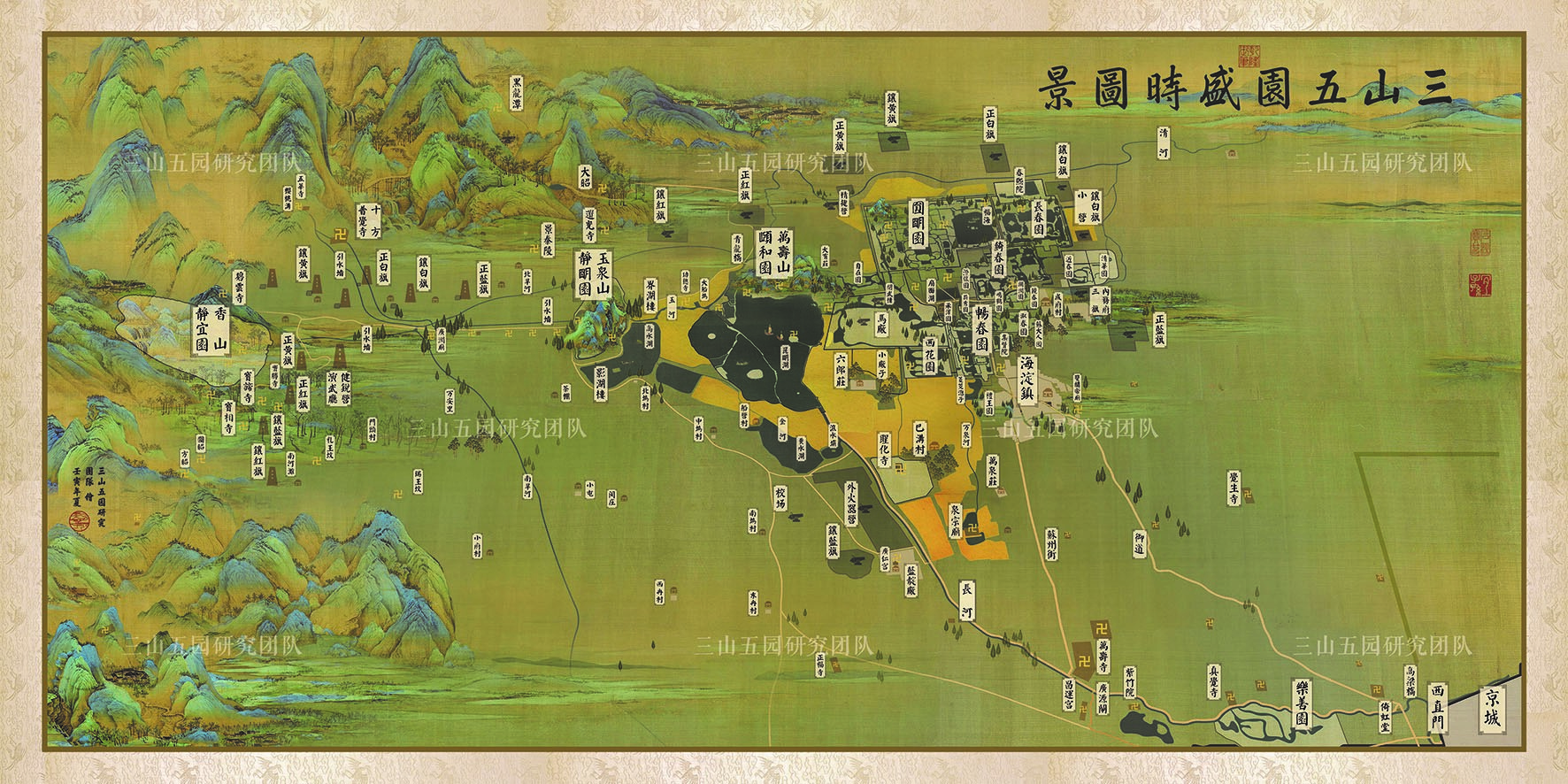 注:三山五园,从通俗意义上讲是指北京西北郊的清代皇家园林群,包括香山的静宜园、玉泉山的静明园和万寿山的颐和园(旧称清漪园),以及畅春园和圆明园;从研究意义上讲它是以五园为核心的人居环境系统,也是清代紫禁城外的政治、文化、军事中心和水利农业重地,而这一文化瑰宝在第二次鸦片战争中尽遭焚毁与破坏。如今的三山五园,是北京历史文化的“金名片”,是传统历史文化与新兴文化交融的复合型地区,它的保护与建设牵动着社会各界人士的心。