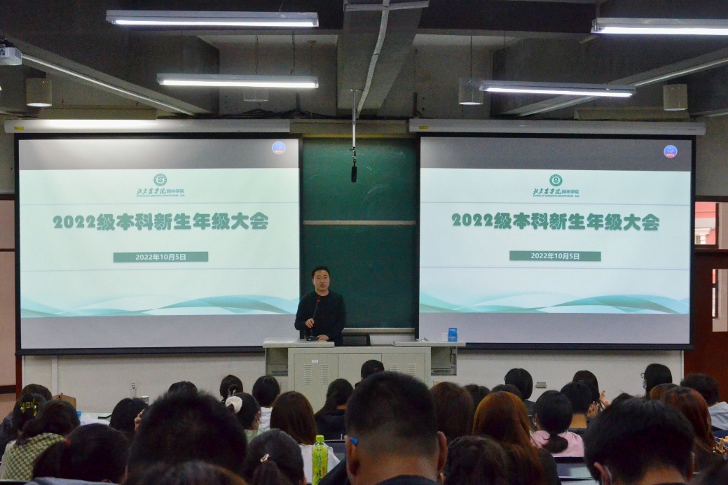 在教学楼B103召开2022级本科新生年级大会。学院党总支副书记、副院长李国政,辅导员武丽、张明婧、许晨晨,专职组织员张烨桐,2022级全体新生参加会议,会议由辅导员杨刚主持。