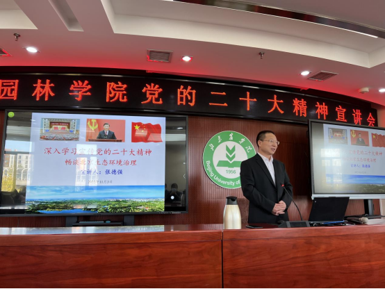 实际和发展前景,阐明了未来建功“推动绿色发展,促进人与自然和谐共生”事业的发展道路。要求学院要力争做强优势学科,提升教学、科研、社会服务水平,培养更多高素质园林人才。希望全体师生努力践行“厚德笃行、博学尚农”的校训精神,以自强不息的奋斗精神,只争朝夕,仰望星空,脚踏实地,进一步谋划好明年乃至今后几年的发展目标和路径,凝心聚力为乡村振兴做出贡献,奋力夺取学院高质量发展新胜利。