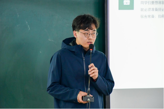 辅导员贾博文对本学期学生宿舍安全卫生大检查的情况、存在的问题进行了通报。详细讲解了学校制定的宿舍安全卫生常见扣分项,包括卫生扣分点、违禁物品范围等内容。并针对扣分规则整理出宿舍打扫指南,如个人区域卫生、公共空间物品摆放、卫生间打扫、禁止吸烟、禁止使用违规电器等。他提出维护宿舍卫生的目的不是为应付检查,是督促大家营造舒适整洁的学习生活环境,也帮助大学生养成良好的生活作息习惯,强化劳动观念,并倡议全体大学生按期打扫宿舍,以昂扬向上、神清气爽的面貌迎接每一天的阳光。