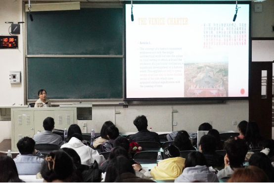 曹新老师是知名的国际遗产保护专家,担任ICOMOS-IFLA ISCCL(国际古迹遗址理事会-国际风景园林师联合会文化景观科学委员会)专家委员、IUCN WCPA(世界自然保护联盟、世界保护地委员会)专家委员、中国圆明园学会理事和学术委员会委员。在两节课的时间中,她借助大量国际文件的原文及国内外的经典案例,以1972年联合国教科文组织《保护世界文化和自然遗产公约》这一里程碑式文件为节点,系统梳理了前后两个时期中世界遗产保护的发展历程及核心思想,论述了“真实性”和“完整性”对于文化遗产保护的重要意义,同时介绍了自然遗产、非物质文化遗产的相关保护理念及实例。