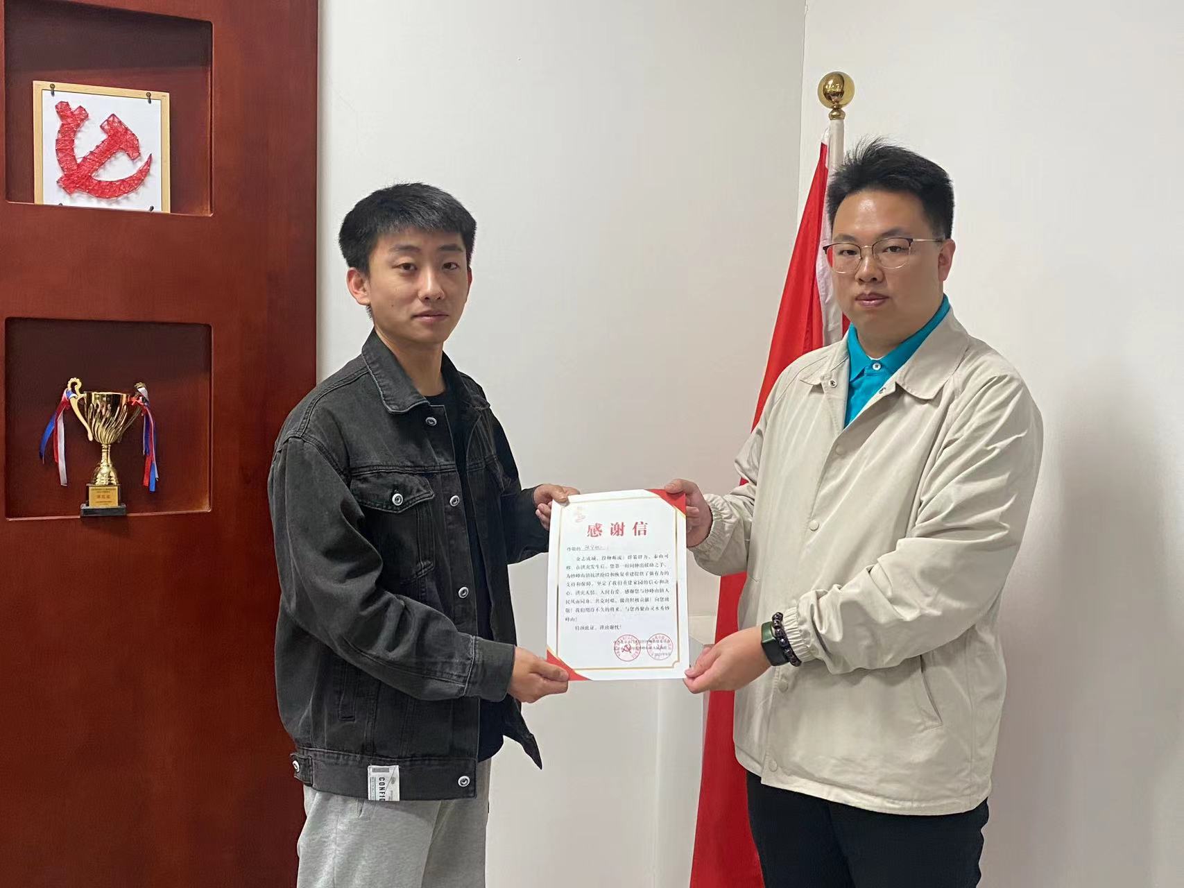 送上感谢信,感谢张宇航同学为水峪嘴村灾后应急处置和村民应急安置提供的重要保障。