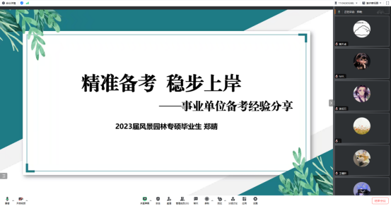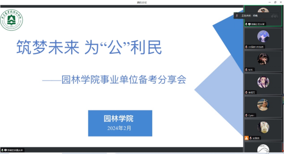 举办了“筑梦未来,为‘公’利民”——事业单位备考经验分享会。会议邀请顺利考取事业单位的2023届风景园林专业研究生毕业生郑晴为全院2024届毕业生开展相关考试经验分享交流。