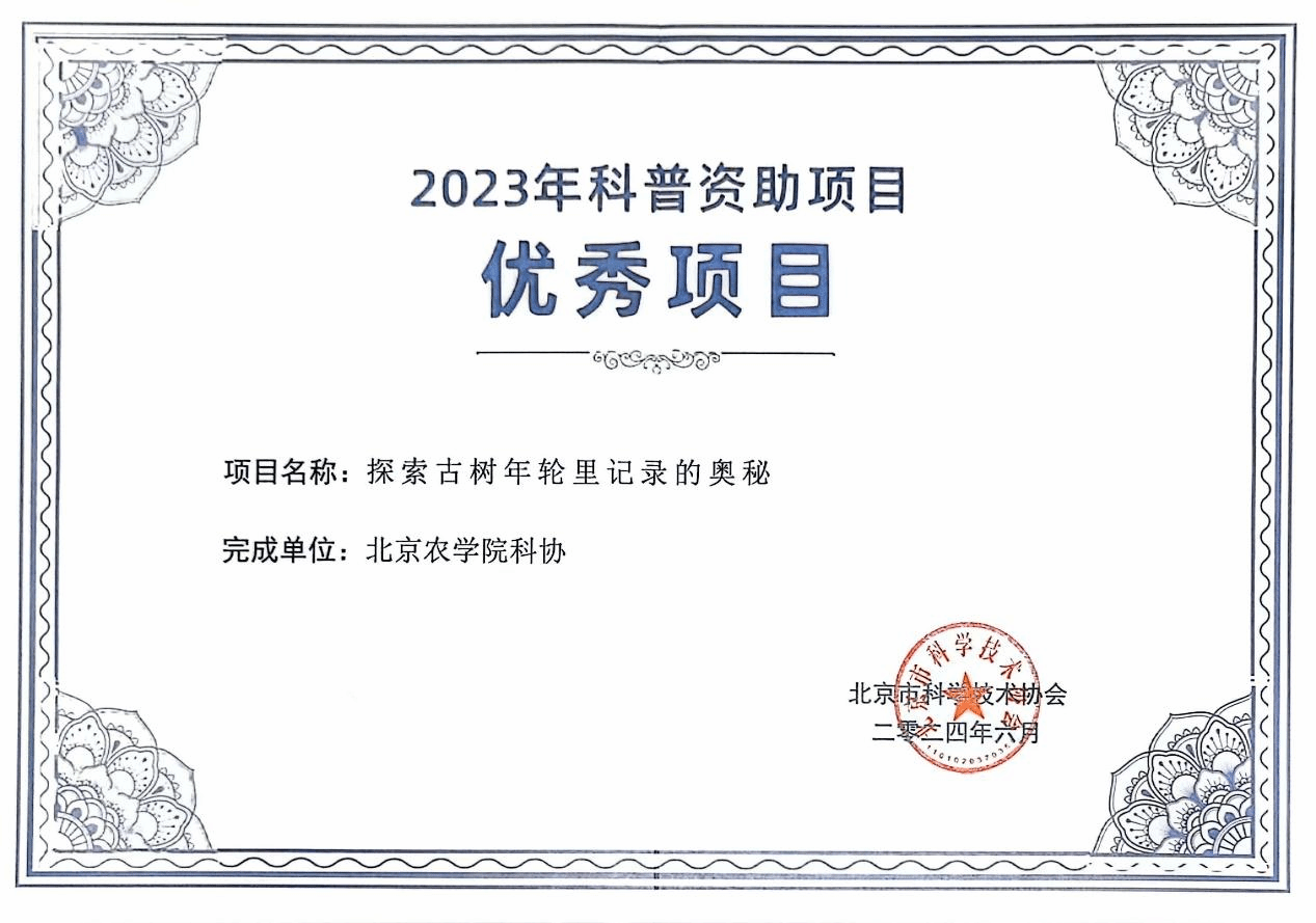冯丽副教授主持的“探索古树年轮里记录的奥秘”项目获评北京市科学技术协会2023年科普资助项目优秀项目。李艳、张文玲老师为项目组成员,古树专班研究生、林学(古树方向)本科生等10余名同学参与了该项目。