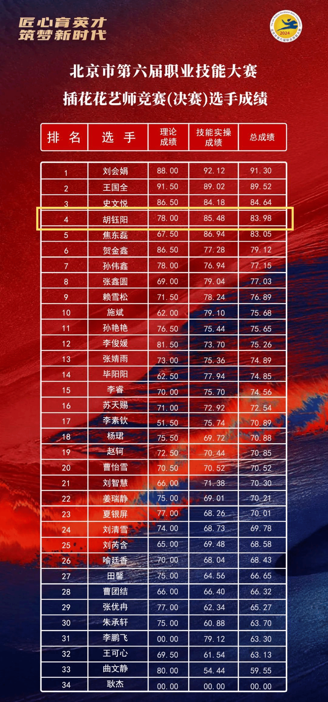 2022级学生胡钰阳表现出色,成功晋级插花花艺师竞赛(决赛)。在34名决赛选手的激烈竞争中,取得第4名优异成绩并获国家一级插花高级技师称号。