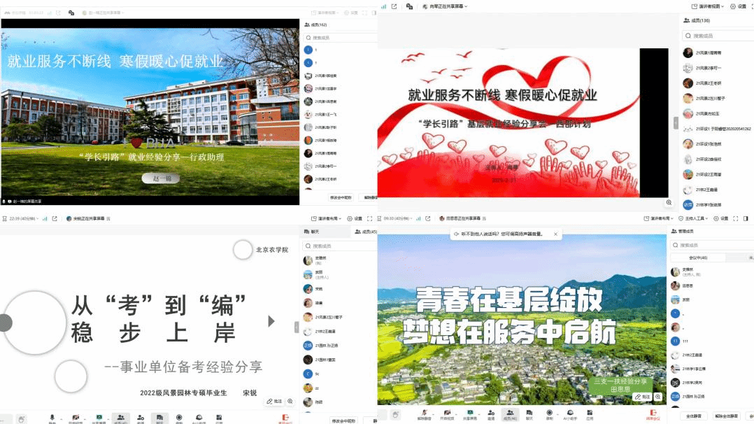 根据假期就业工作特点和需求,学院细化工作安排,开展就业技能辅导会与校友就业经验分享会,分享会上邀请2023届林学专业本科毕业生、2023年北京市大学生志愿服务西部计划志愿者向琴;2024届林业专业研究生毕业生、北京农学院团委行政助理赵一锦;2024届风景园林专业事业单位上岸研究生毕业生宋锐;2024届林学专业三支一扶上岸本科毕业生田思思进行就业经验分享,帮助2025届毕业生进一步掌握相关政策信息,发掘自身的特点、选择合适的岗位,更加充分的进行备考,以提高考试成功率。