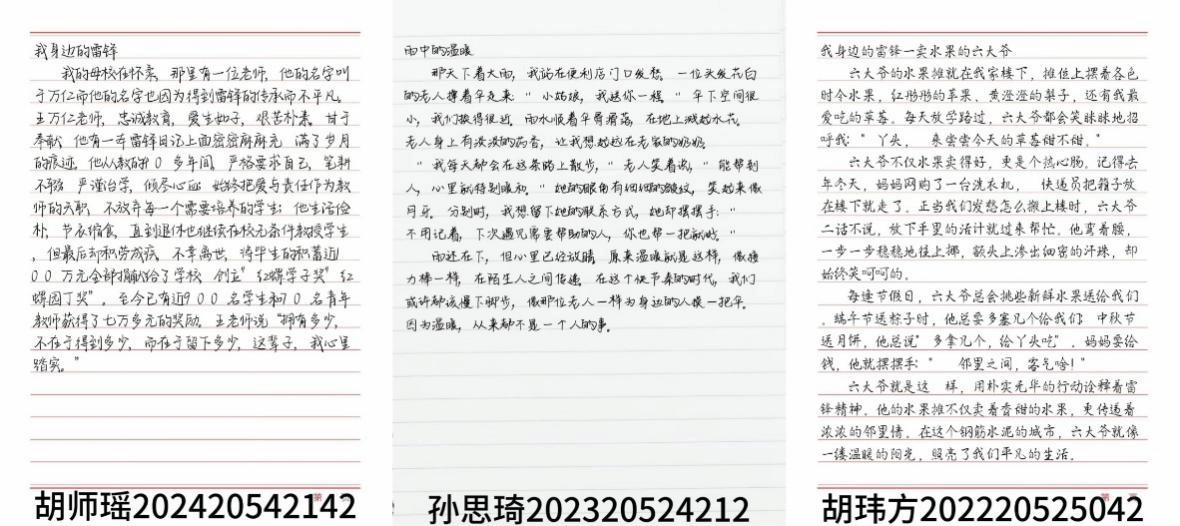 弘扬雷锋精神,做新时代“雷锋精神”的传承者。同学们贴近实际,贴近生活,结合发生在自己身边的人和事,开展“身边雷锋事迹”征文活动,用文字记录下身边助人小事、奉献瞬间。营造雷锋精神人人可学,志愿奉献处处可为的生动局面,让雷锋精神在学生心中生根、开花、结果。